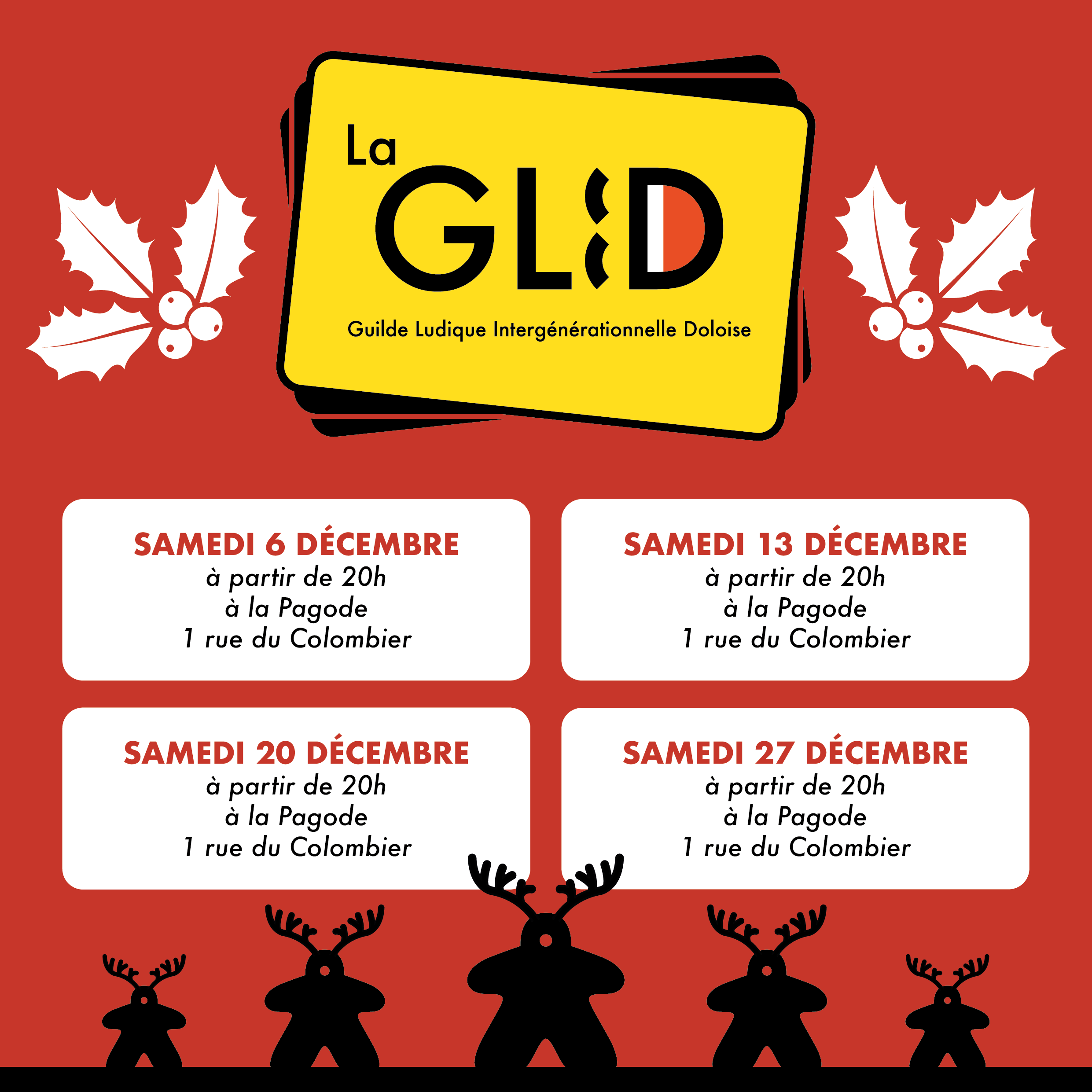 La GLID rassemble joueurs et joueuses de tout poil pour découvrir et faire découvrir une quantité de jeux, qu’ils soient de cartes, de rôle, de plateau, de main, mais pas de vilain (ou alors juste un peu). Au plaisir de se rencontrer !